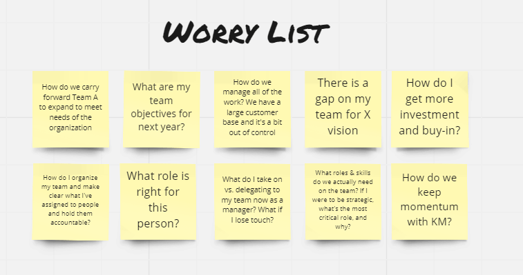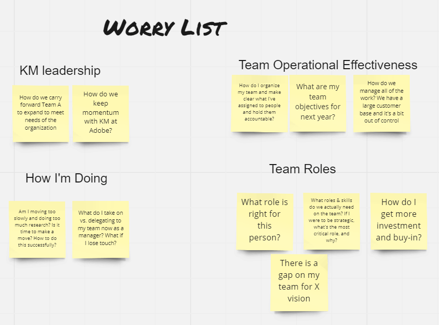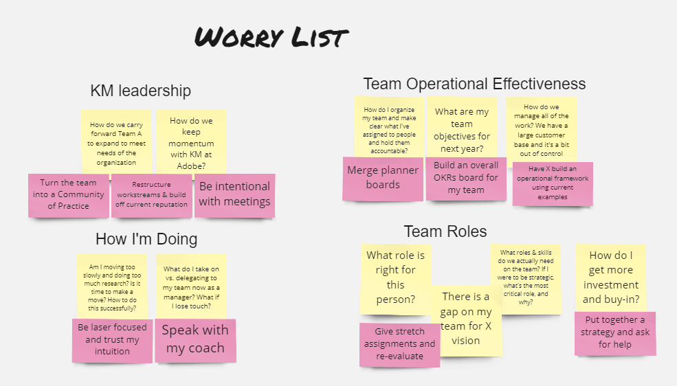 After a couple of weeks, I go back to my worry list and reflect. Have I made progress? Anything that needs to change? I’ve found that by addressing my worries in this way, I sometimes come up with new ideas that have shifted our organization, such as creating a North Star for my team, and I sometimes find patterns over time of the same worries appearing again and again, such as resourcing constraints. When these continue to appear, I know that I haven’t addressed the root and there’s a bigger action that needs to be taken.